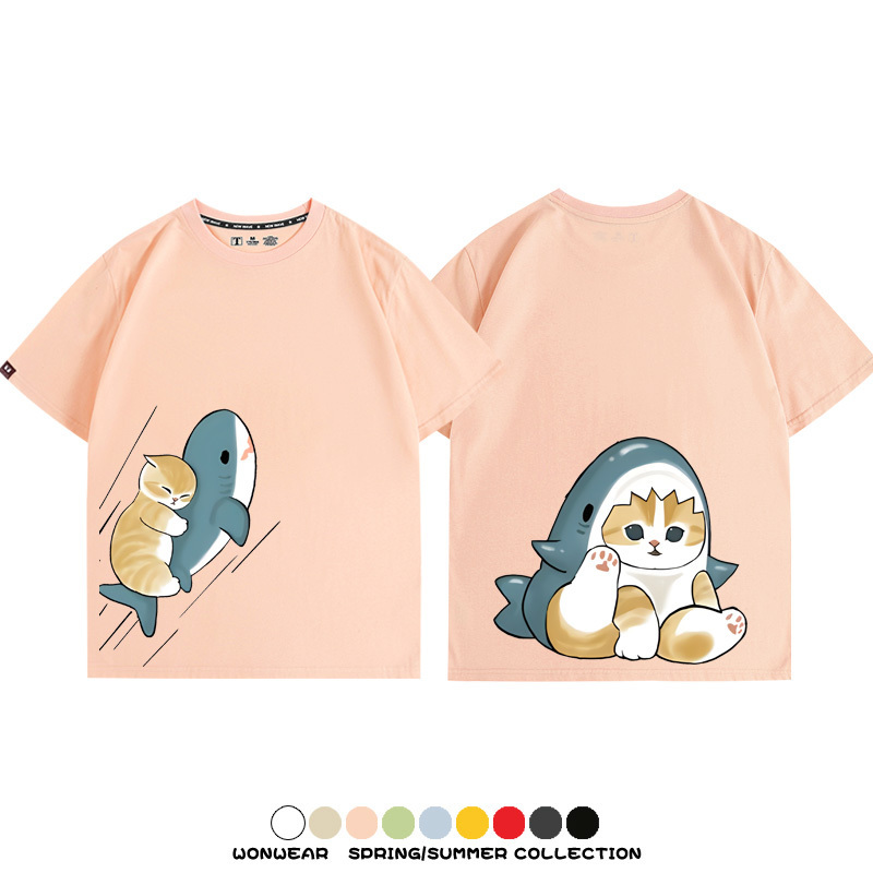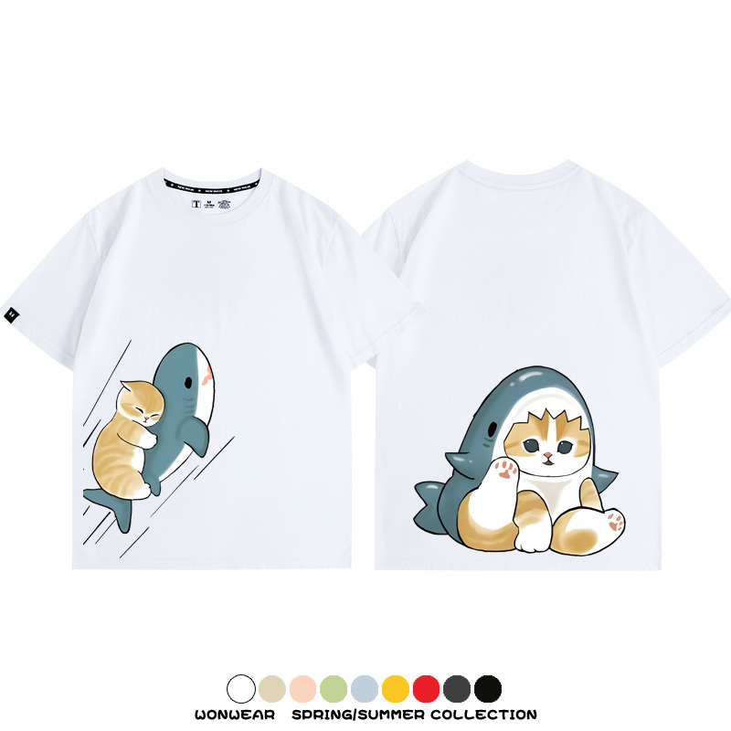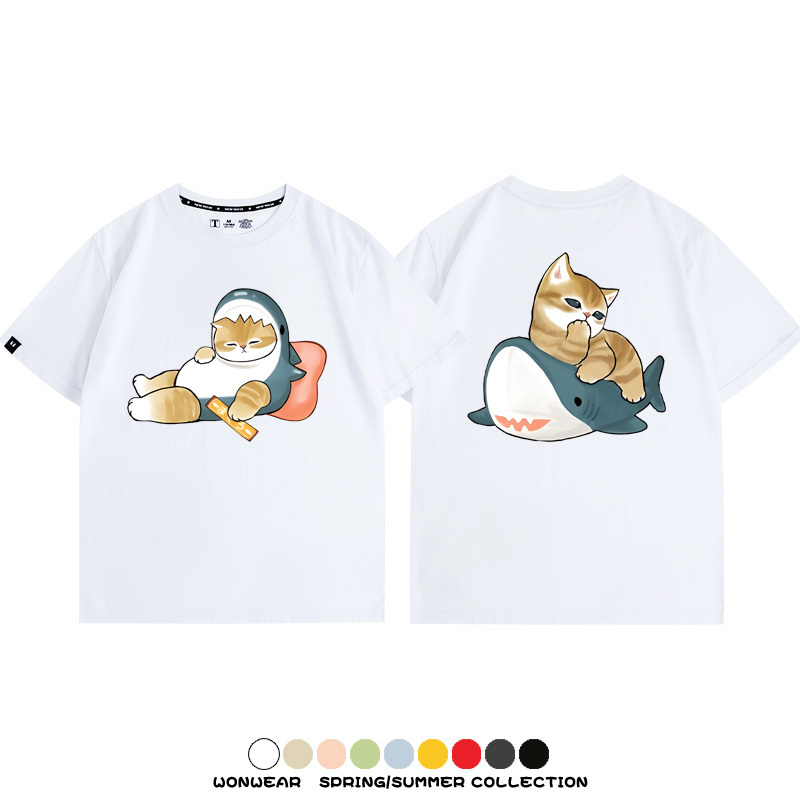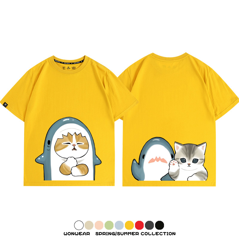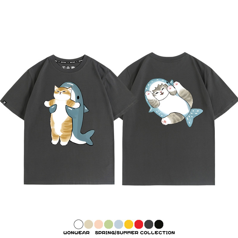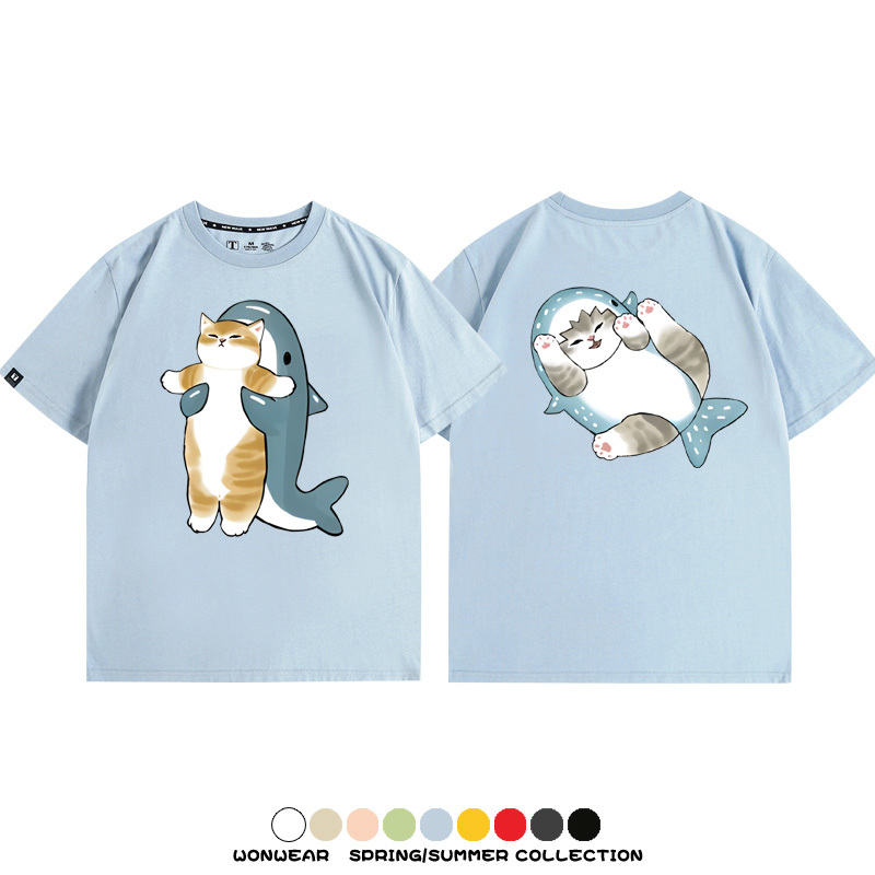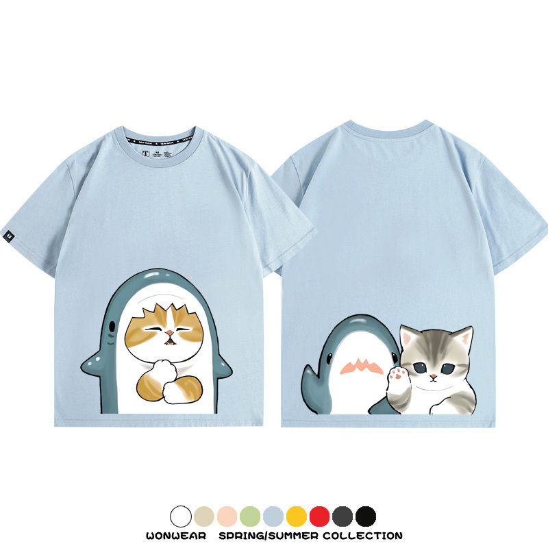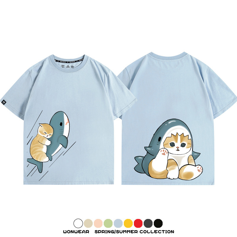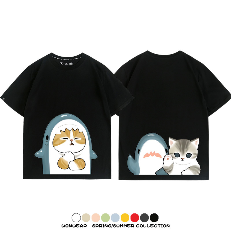 Cute Cat Fu Sandy Shark COS Cat Shark Japanese couple tops linked short-sleeved T-shirt summer pure cotton loose and versatile