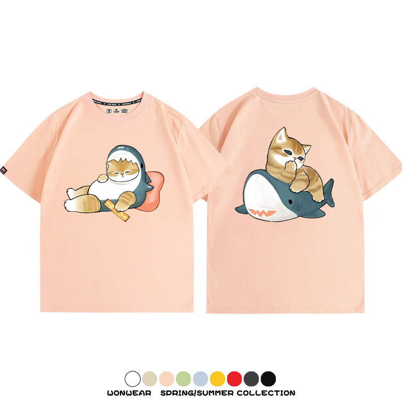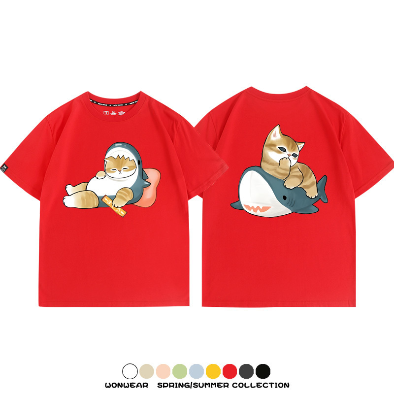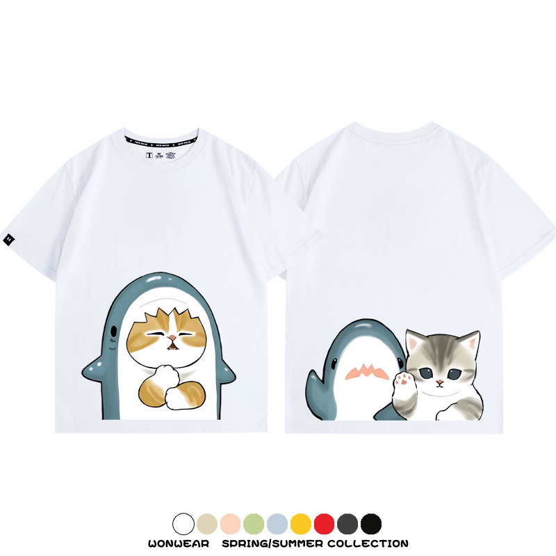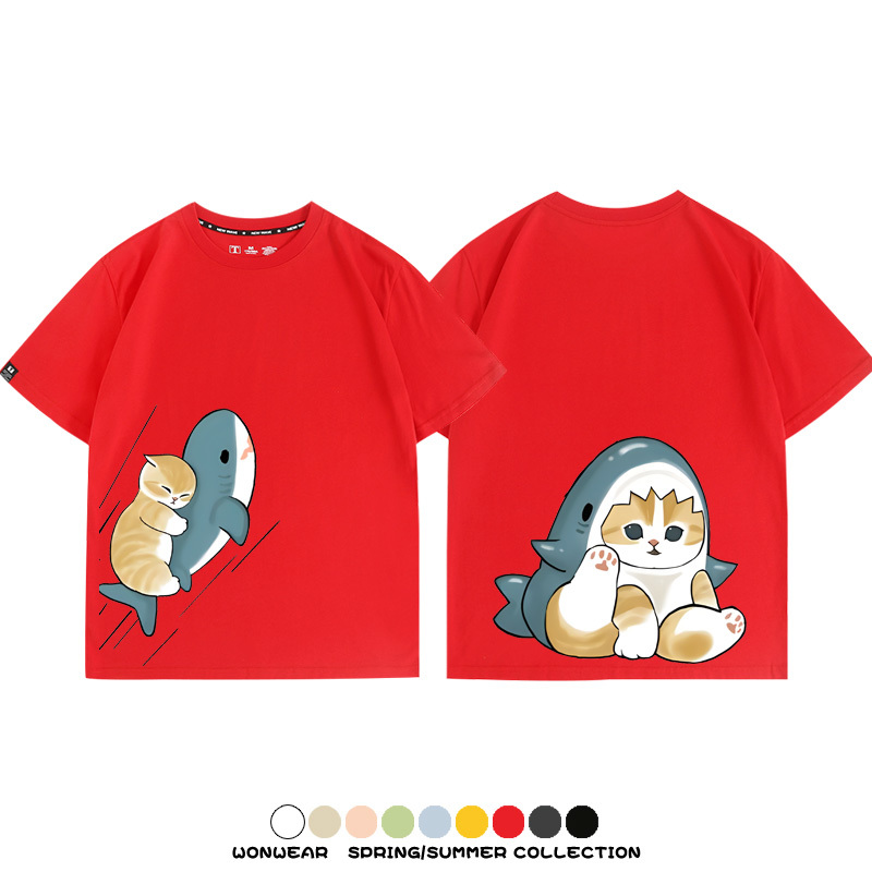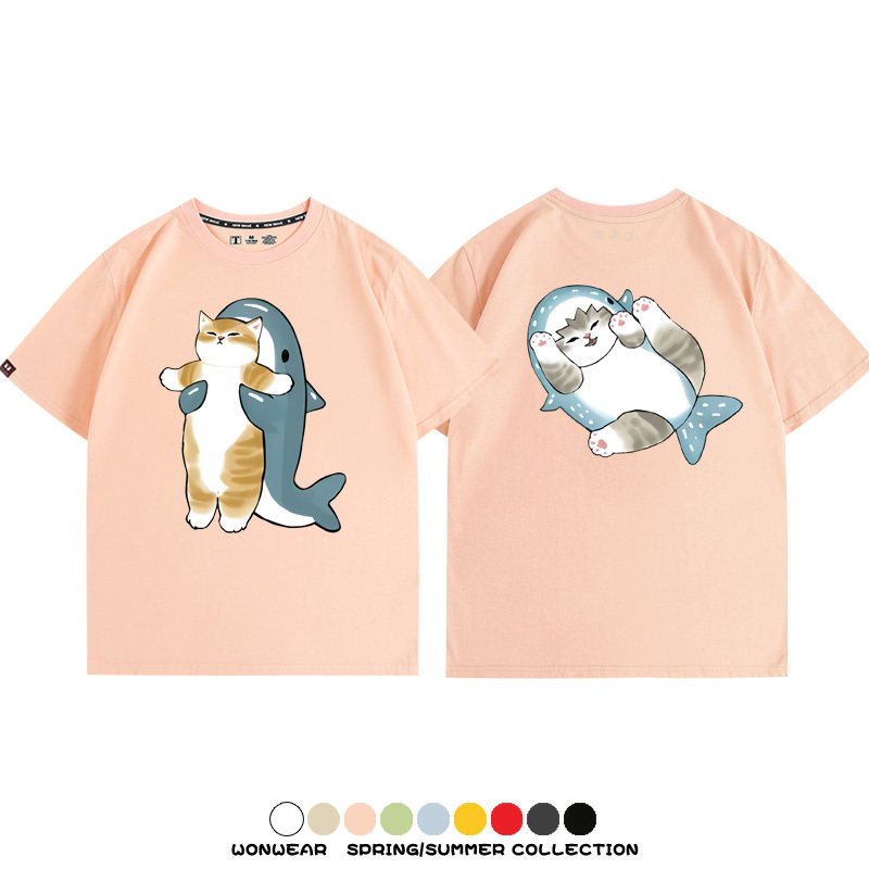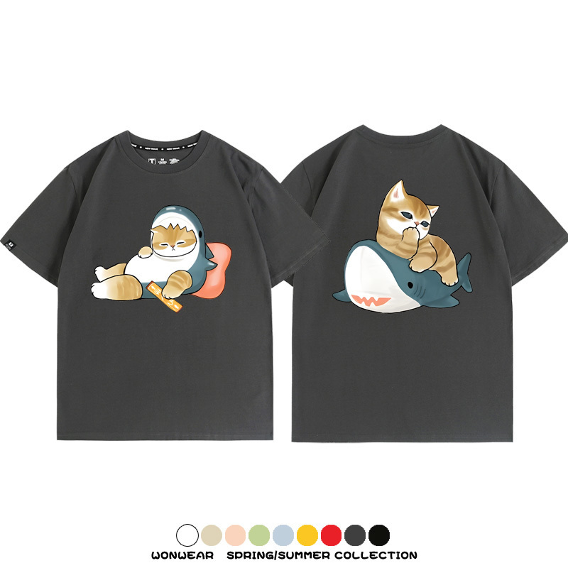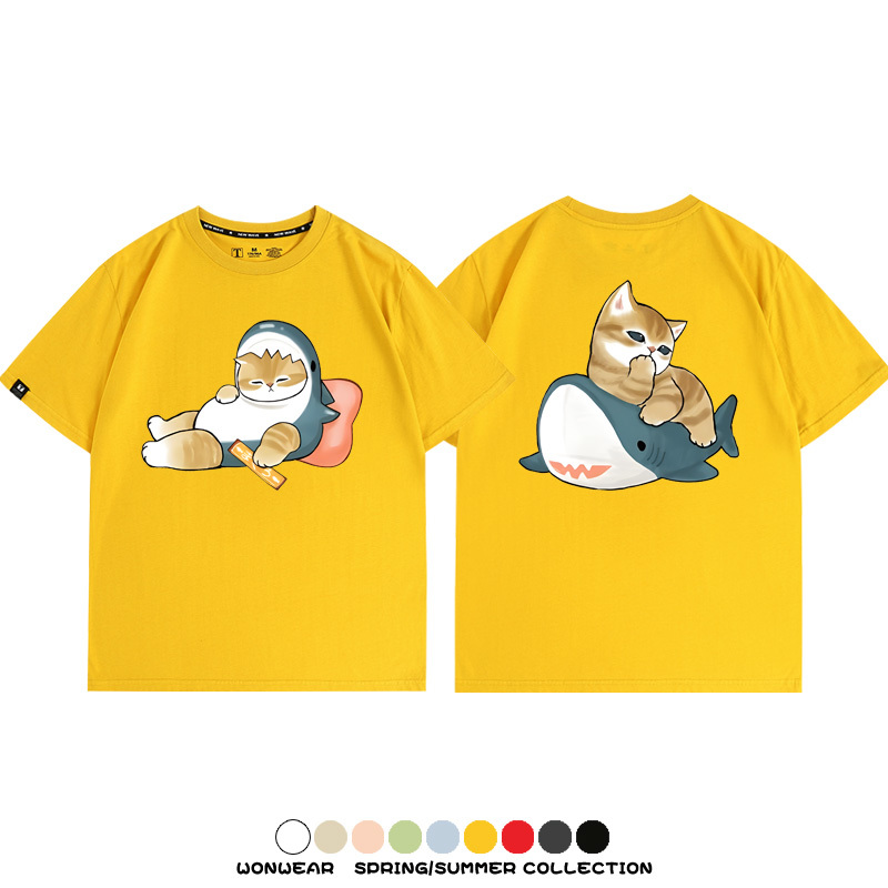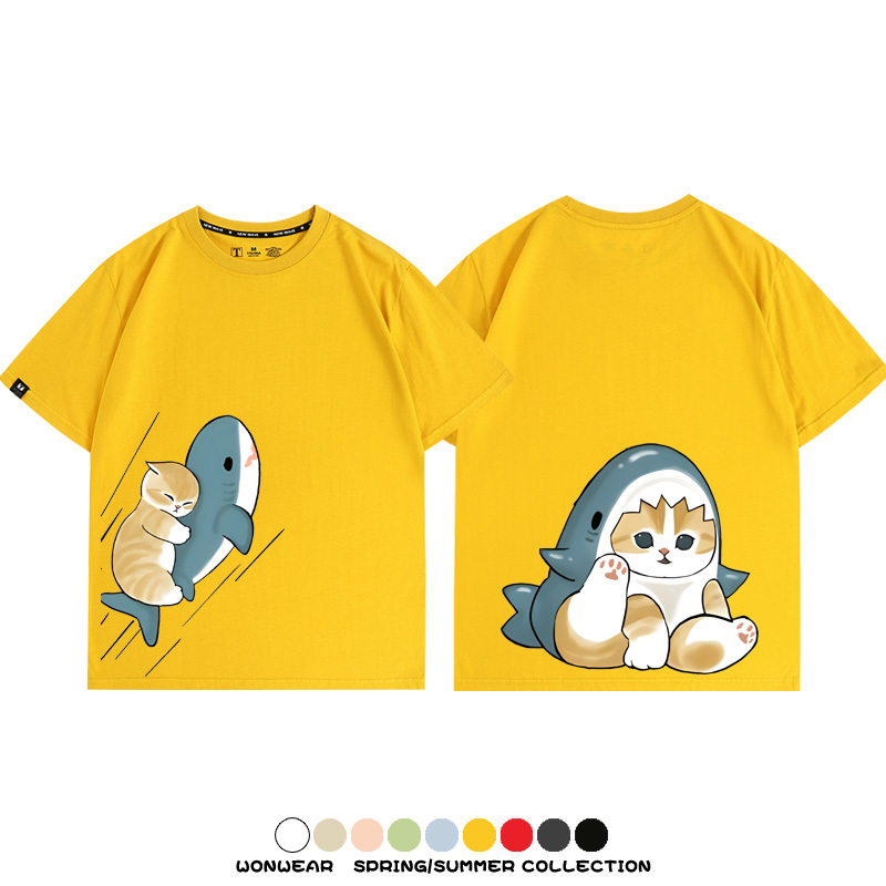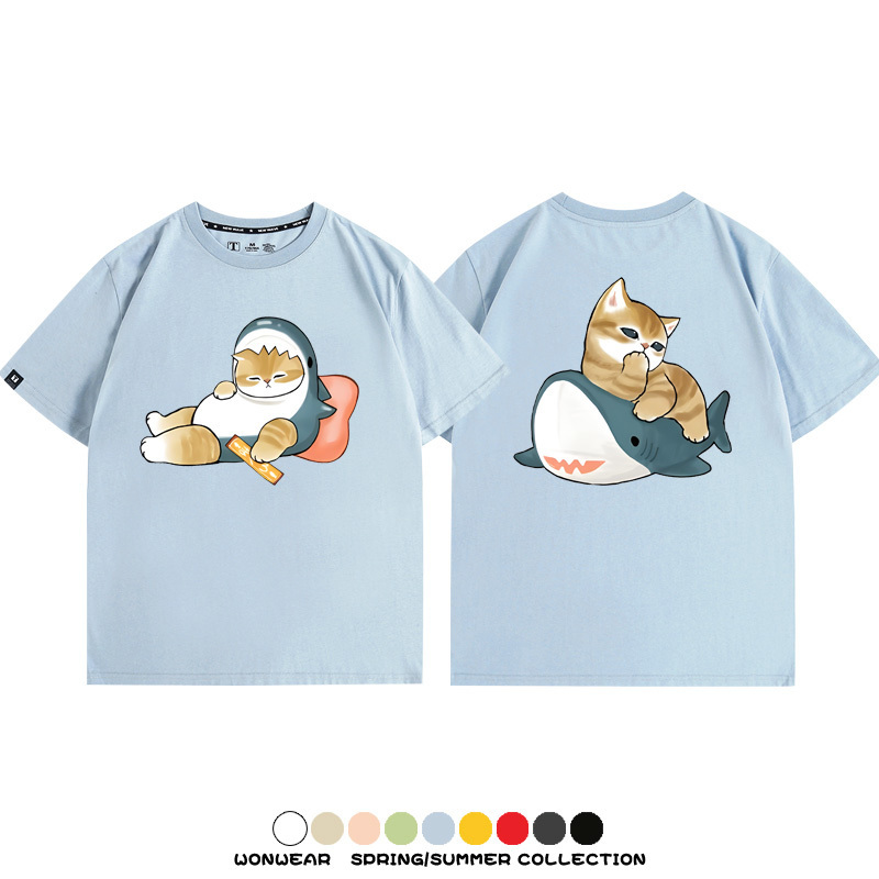 Cute Cat Fu Sandy Shark COS Cat Shark Japanese couple tops linked short-sleeved T-shirt summer pure cotton loose and versatile