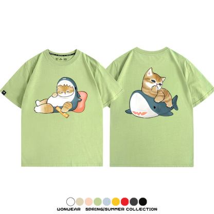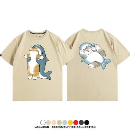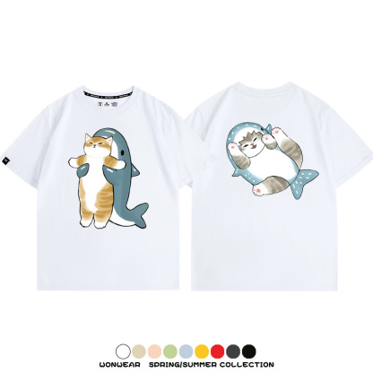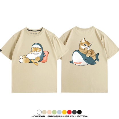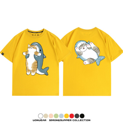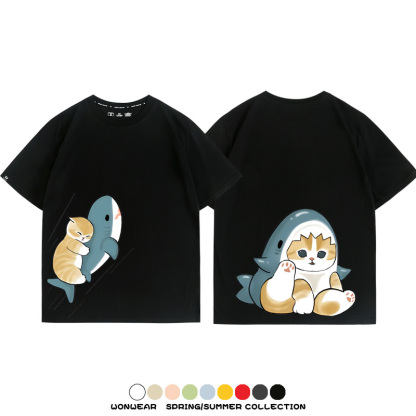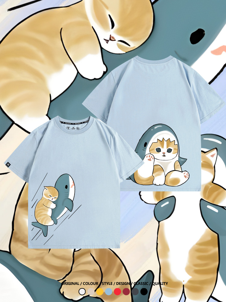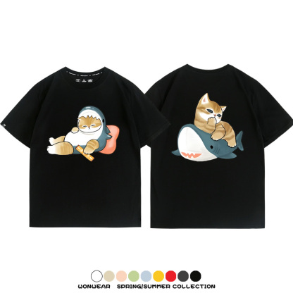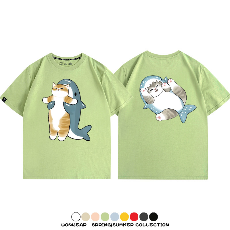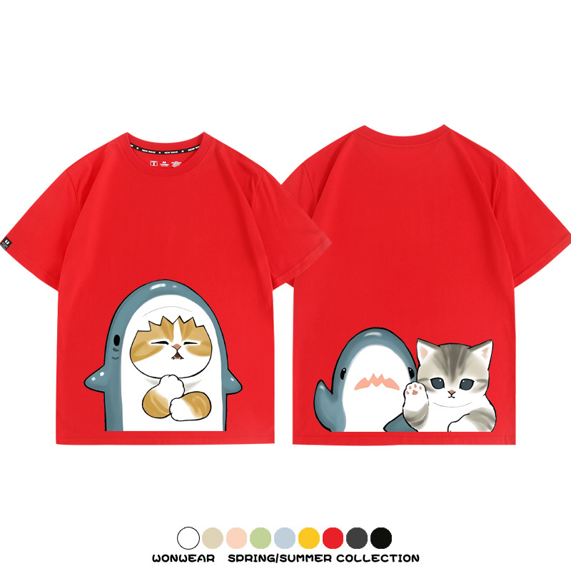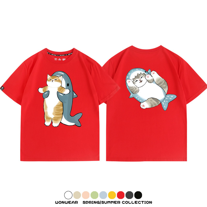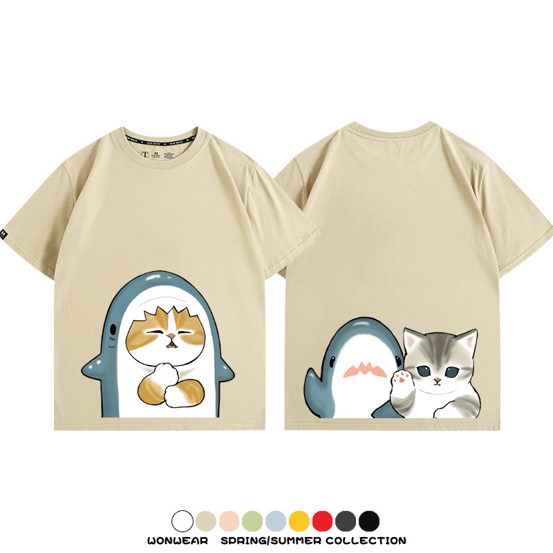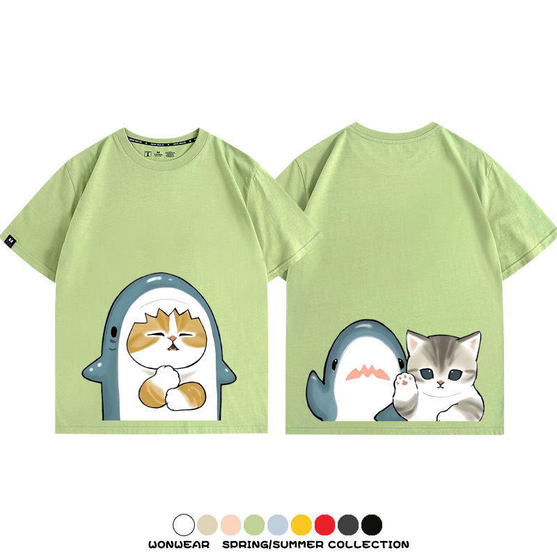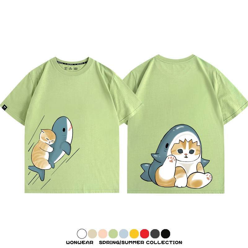 Cute Cat Fu Sandy Shark COS Cat Shark Japanese couple tops linked short-sleeved T-shirt summer pure cotton loose and versatile